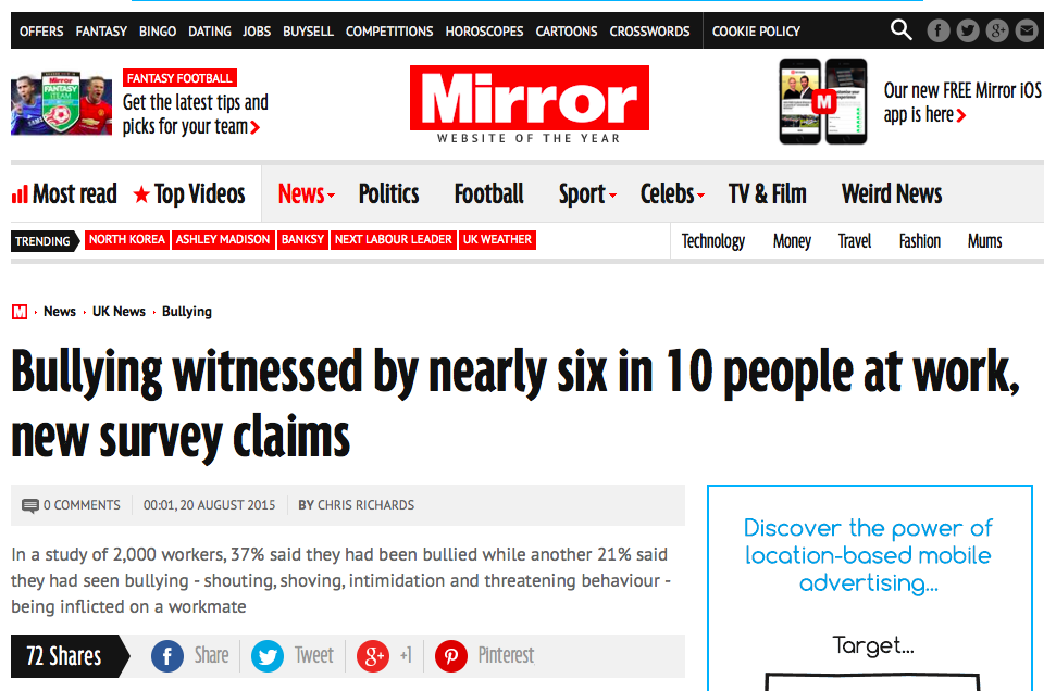 But it is the middle of the Silly Season. Which perhaps explains why leading law firm Slater & Gordon thought it a good idea to press release its new research with a claim that “almost six in 10 people have witnessed or suffered bullying in the workplace”. Again, there is no link to any actual ‘report’ that might explain the research methodology – despite the press release explicitly referring to “the report” – so I contacted Slater & Gordon to ask for a copy. They told me that the research report exits, but cannot be shared “externally at this stage as some of the details are commercially sensitive”, and referred me to the generic methodology of market researchers Censuswide, who conducted the survey of 2,000 of their 69,000 (remunerated) panel members for Slater & Gordon. And, subsequently, Censuswide told me: