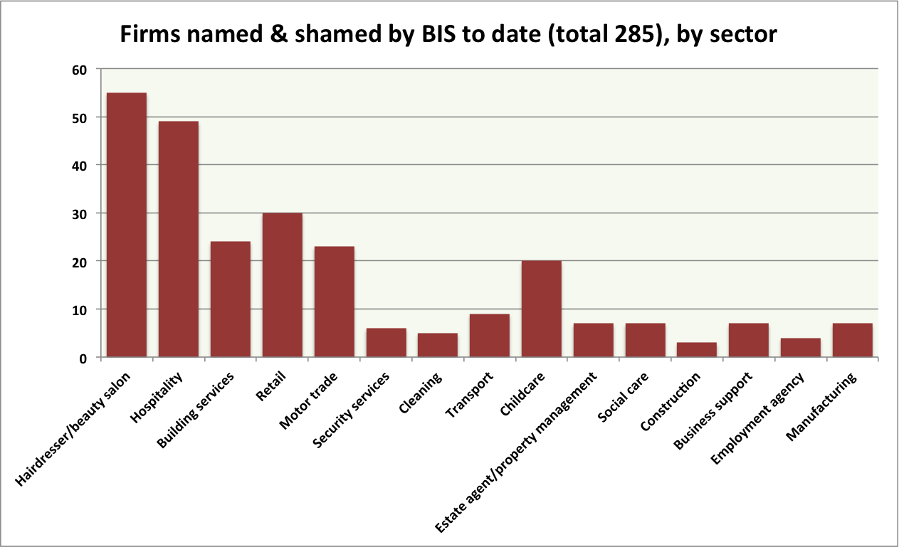 Looking at the details of the tranche of 75 employers ‘named & shamed’ in July, it’s easy to see why Cameron’s announcement did not include any increase in the maximum penalty per worker, as not one of the 75 had to pay anywhere near £20,000 in penalties. The average total underpayment (and so penalty) was just £2052.86, and the average underpayment per worker just £1247.37. In 37 of the 75 cases, the total underpayment (and so penalty) was less than £1,000, and in all but ten it was less than £5,000. In 46 cases, just one worker was underpaid, and only in five cases were ten or more workers underpaid by the employer. One case involved 57 workers, and another 46 workers, but the underpayment per worker in those cases was just £71.41 and £6.61 respectively.