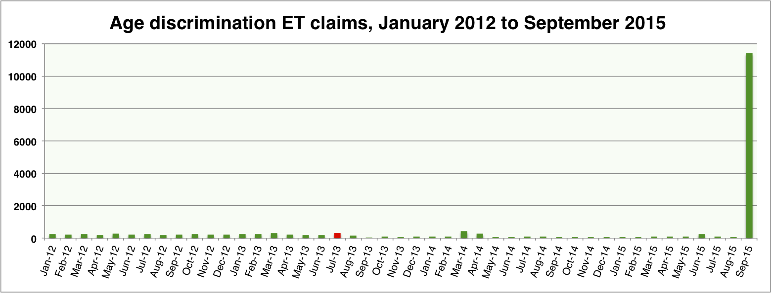 Yet, over the same period, the total number of ET cases fell, from 1,555 in May 2015, to 1,453 in August, and 1,433 in September. How does that fit with the stellar increase in age discrimination and equal pay claims in September?