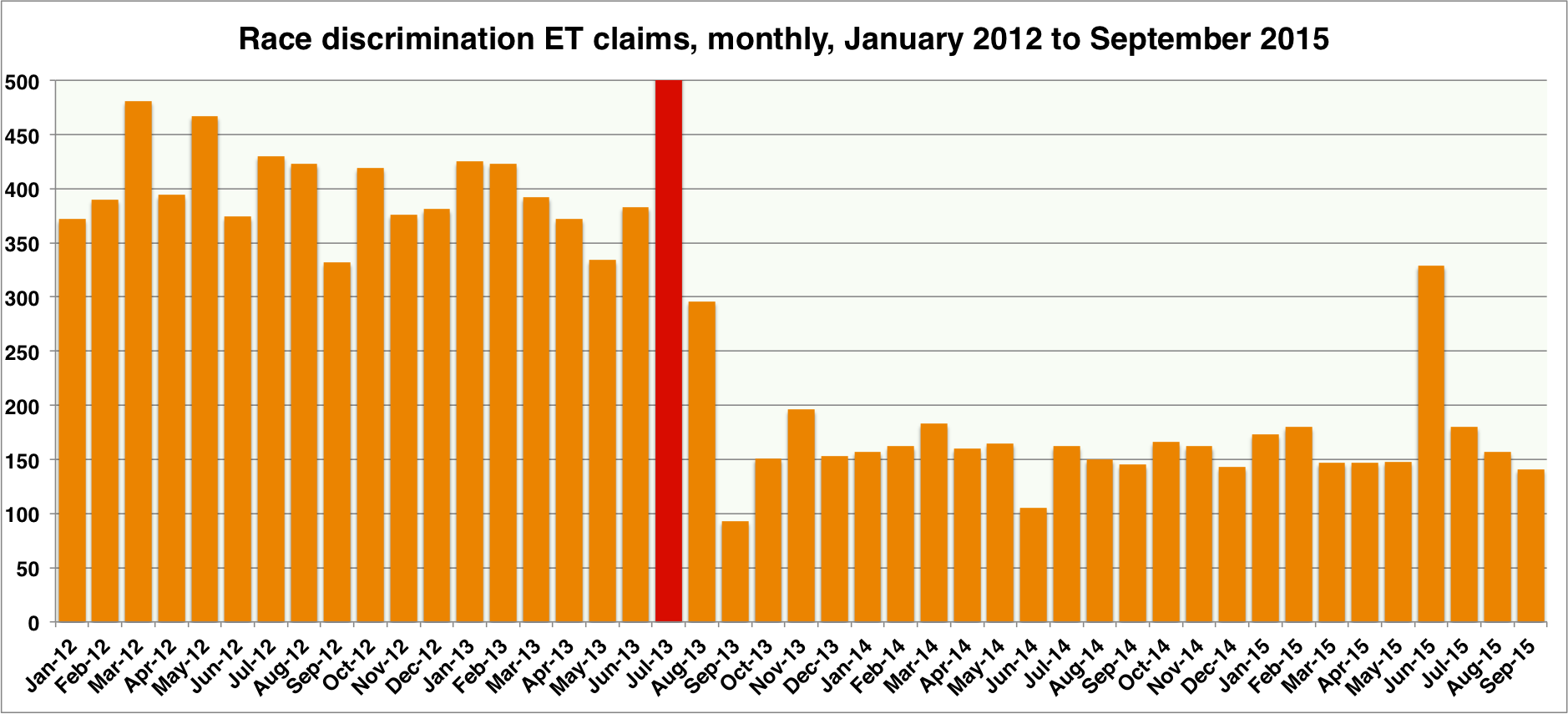 But an article in the Guardian earlier this week by the campaigning journalist Frances Ryan – about how, thanks to fees, disabled workers cannot afford to challenge workplace harassment and discrimination – had me scurrying back to add the monthly figures for July, August and September 2015 to these three charts, created when the latest available figures were those for April to June: