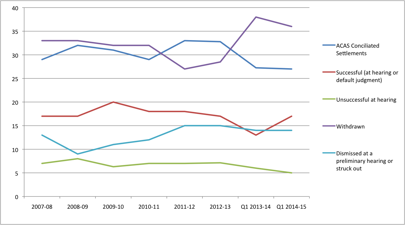 Now 32.3 per cent is not an insignificant proportion – equal pay and unlawful deductions from wages are two of the most commonly claimed jurisdictions. But it is very unlikely indeed that anywhere near all of those jurisdictional claims would disappear off to the County Court, not least because many are brought in conjunction with other jurisdictional claims – such as unfair dismissal, and discrimination – that can only be brought in the tribunal. And, indeed, the Ministry’s tribunal statistics show that, in our six-month period October 2013 to March 2014, the four transferrable jurisdictions accounted for 29.8 per cent of all 48,283 jurisdictional claims. (We can even extend our period to September 2014, because the impact of Acas early conciliation is largely irrelevant here, and then we get a figure of 33.6 per cent).